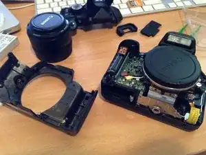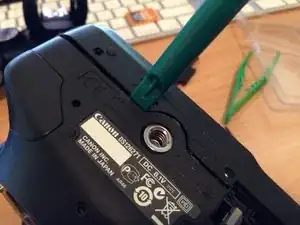 Подденьте нижнюю часть камеры инструментом для вскрытия или отвёрткой. Передняя панель должна начать открываться, но её нужно поднять (поддеть) через место крепления штатива. Может помочь небольшая отвёртка, просунутая под панель через отсек батареи.