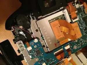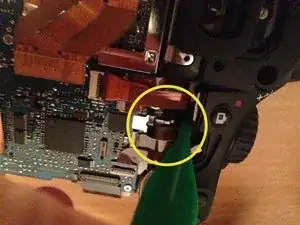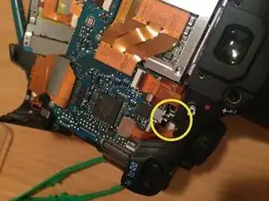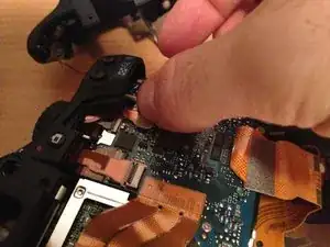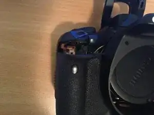 Найдите ленточный разъём, соединяющий основную плату с верхней крышкой, расположенный рядом с кнопкой «приблизить», под правым большим пальцем при работе с камерой.