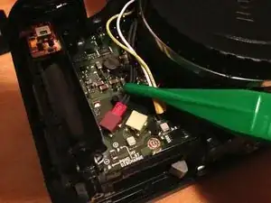 На передней части камеры отсоедините красный и жёлтый провода от платы. Если у Вас есть пластиковый пинцет, просто потяните их в сторону от разъёмов.