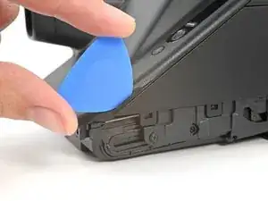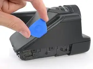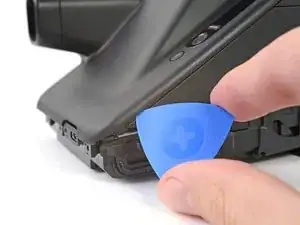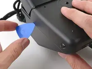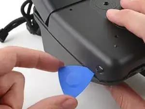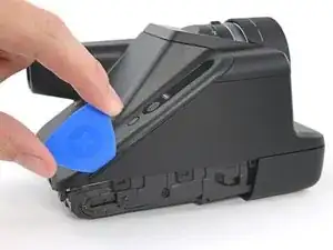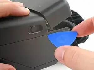 Под углом вставьте лезвие в зазор в правом верхнем углу между верхней и передней крышками, рядом с вспышкой.