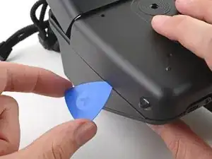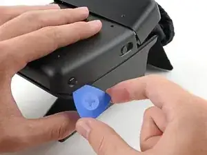 Наклоните медиатор вверх и вставьте его в зазор, где правый нижний угол задней крышки встречается с треугольным наконечником правого края передней крышки.