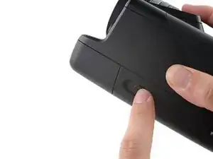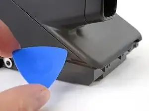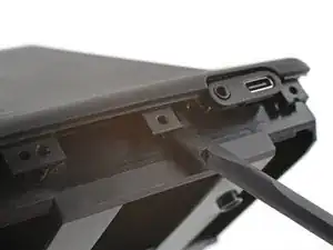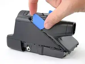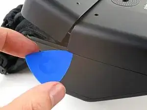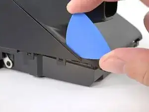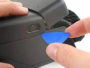 Вставьте кончик медиатора для вскрытия под верхний левый угол нижней крышки, рядом с ползунковой кнопкой.