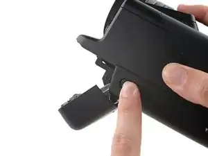 Наклоните заднюю часть нижней крышки вверх и оттяните её от камеры, следя за тем, чтобы вывести рычажок дверцы отсека из выемки.