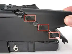 Следующие шесть шагов показывают, как освободить защёлки верхней крышки. Эти защёлки могут легко защёлкнуться снова, поэтому возможно потребуется повторить некоторые шаги, чтобы освободить все защёлки.