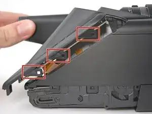 Снимите заднюю крышку с камеры и поверните её через правый край, чтобы открыть гибкий кабель.