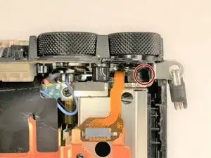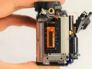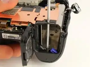 Чтобы получить доступ к задней части камеры, снимите винты, крепящие петлю ЖК‑экрана к корпусу камеры.