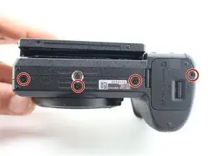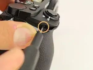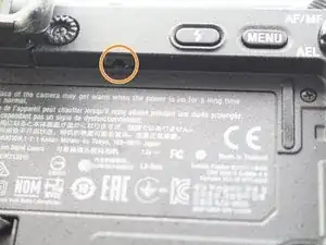 Снимите винт JIS 00 длиной 2,5 мм с боковой стороны камеры рядом с видоискателем.