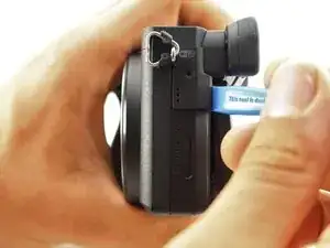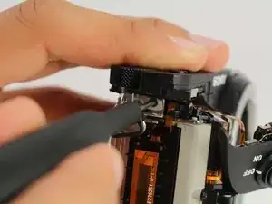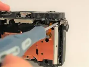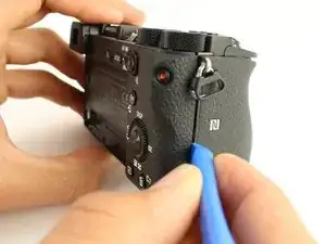 Используйте пластиковый инструмент для вскрытия, чтобы начать отщёлкивать заднюю панель камеры со стороны.