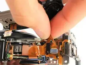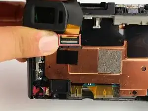После демонтажа петли экрана будьте осторожны, чтобы не порвать чёрную ленточную шлейф‑перемычку, соединяющую экран с корпусом камеры.
