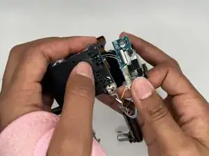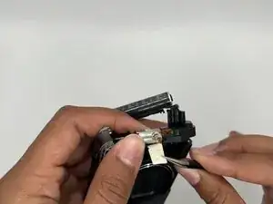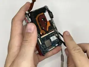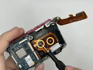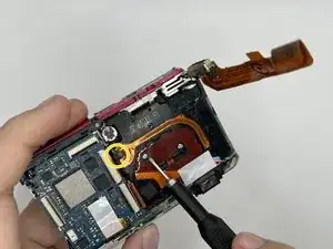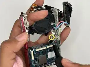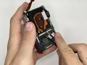 Отсоедините плоский шлейф, соединяющий материнскую плату с блоком объектива, пинцетом.