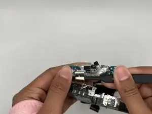 Поднимите чёрную защёлку на верхнем плоском шлейфе пинцетом.