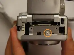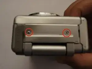 Найдите и выкрутите два винта на той же стороне камеры, где отмечен A/V-разъём (2x маленькие с крестовой шлицей).