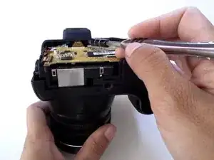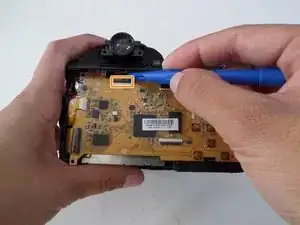 Используйте пластиковый инструмент для открывания, чтобы поддеть заднюю часть корпуса камеры от передней части корпуса.