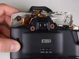 Снимите два чёрных винта Phillips #00 5.0 мм на панели видоискателя, чтобы снять видоискатель.