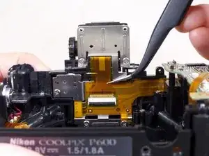 Используйте пинцет с тонкими концами, чтобы удалить большой ленточный кабель, расположенный под винтом.