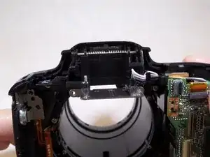 Действуйте осторожно, поскольку ленточный кабель медленно выходит из паза при извлечении видоискателя.
