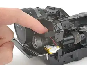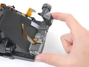 Оттяните переднюю крышку от объектива, чтобы освободить зажимы вдоль переднего края, и выдвиньте видоискатель из его выреза.