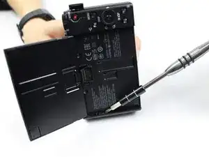 Используйте отвертку PH000 с крестообразным шлицем, чтобы выкрутить винты. Начинайте отвинчивать с нижней части камеры. В конце этого шага будет всего пять чёрных крестообразных винтов 0.4 мм. Разместите их на магнитном коврике или в пластиковом пакете.
