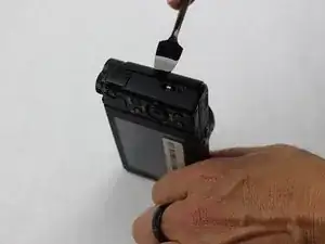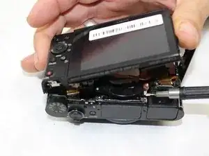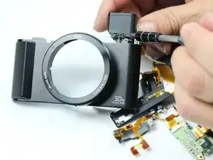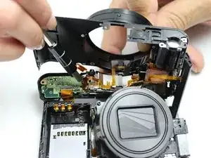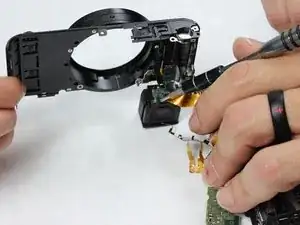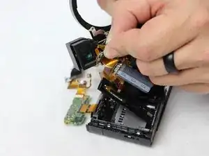 Аккуратно оттяните печатную плату от верхней панели камеры. Верхняя панель будет отсоединена от остальной части корпуса. Снятие верхней части камеры облегчит доступ к видоискателю.