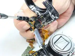 Ищите винты на печатной плате. Эти винты позволяют тонкой золотой плёнке/пластиковой ленте соединять верхнюю панель с остальной частью камеры.