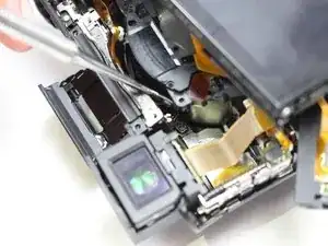 Найдите ещё один чёрный крестообразный винт 0.3 мм, расположенный в нижней части видоискателя. Этот винт прикрепляет печатную плату к видоискателю.