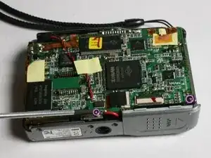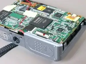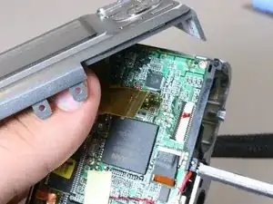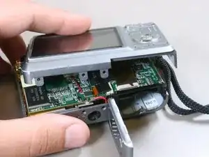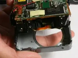 Задняя половина (та, что с экраном) теперь должна быть отделена от остальной части камеры, но всё ещё соединена гибким шлейфом.