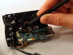 Освободите зажим пинцетом и отсоедините шнуры, проходящие через рамку боковой панели — это позволит полностью разобрать оставшуюся часть камеры.