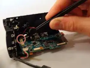 Используя пинцет, аккуратно отсоедините чёрный и белый провод, подключённые к нижней части платы возле панели объектива.