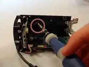 Удалите два винта 5 мм рядом с объективом на противоположной стороне от места крепления ЖК-экрана.