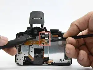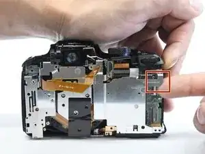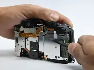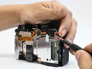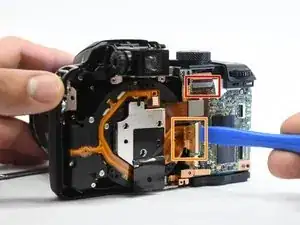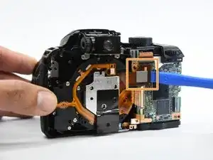 Чтобы выполнить большинство замен в камере Nikon Coolpix B700, необходимо снять заднюю крышку и освободить внутреннюю металлическую скобу. Это требуется перед заменой материнской платы, объектива, блока кнопок или других компонентов.