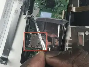 Отогните нижний левый угол термоленты, чтобы обнажить слот для microSD на плате.
