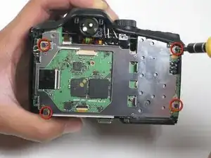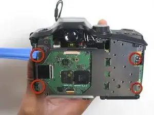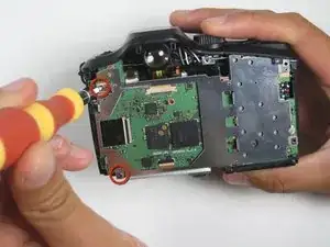 Начните со снятия первого винта на задней панели фотоаппарата.