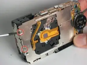 Открутите два винта длиной 2,4 мм с боковой стороны камеры, расположенные рядом с экраном, с помощью отвёртки Phillips #00.