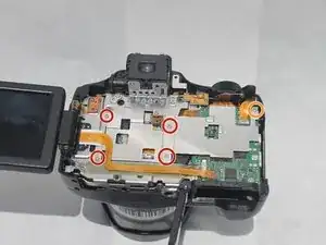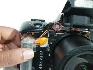 Снимите один серебристый винт 2 мм #00 Phillips на передней стороне рядом с блоком вспышки.