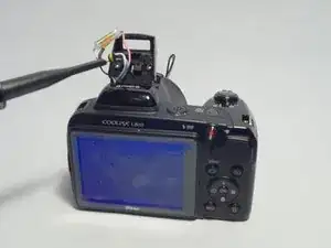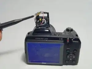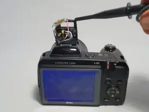Удалите два винта Philips #000 длиной 5 мм под компонентом вспышки.