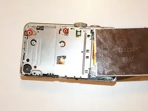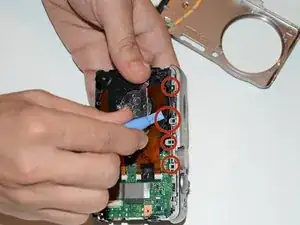 С помощью небольшой отвёртки удалите винт 3,7 мм возле зелёного чипа внутри камеры, как показано. Это освободит верхнюю часть камеры.