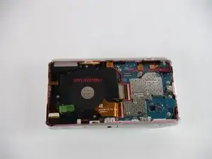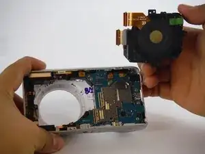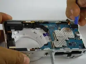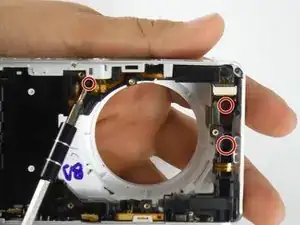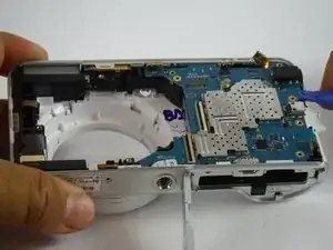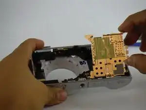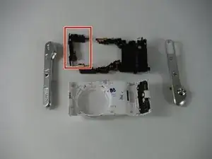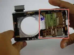 После удаления экрана и батареи, чтобы получить доступ внутрь камеры, обратите внимание на два основных узла внутри — узел объектива и основную материнскую плату. Узел объектива находится слева.