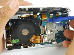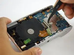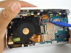 После снятия всех винтов используйте пластиковый инструмент для открывания, чтобы аккуратно отжать разъем для наушников от его корпуса. Этот разъем удерживает материнскую плату на месте.