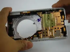 Теперь остались только рамка и чёрная внутренняя рамка. Чтобы добраться до сборки вспышки, чёрная рамка должна быть полностью снята.