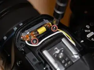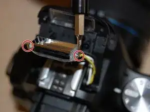 Когда головка вспышки поднята, отвинтите два чёрных винта с крестообразной головкой, длиной 4 мм, расположенные по обеим сторонам лампы вспышки.