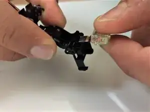 Используйте пинцет, чтобы извлечь два соединителя-ленту под задней панелью. Один соединяет ЖК-дисплей, а другой соединяет правую сторону за отсеком для батареи.