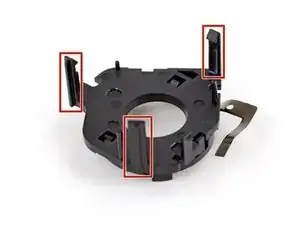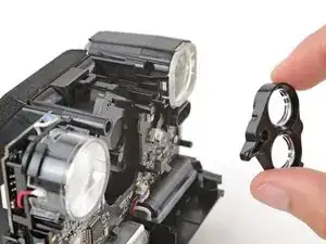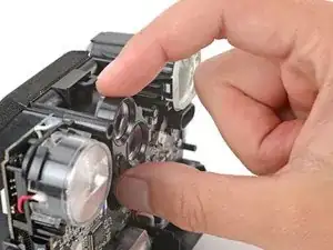 Используйте лопатку, чтобы осторожно поджать внутренний объектив и отвести его в сторону, чтобы получить доступ к нижней защёлке внешнего объектива.