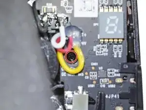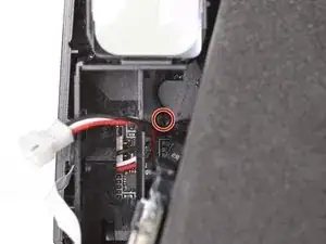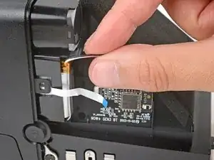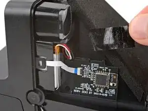 Снимите кусочек скотча, фиксирующий батарею и её кабели (ниже видоискателя), пальцами.