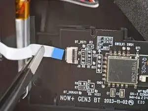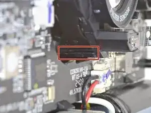 Используйте лопатку, чтобы приподнять запирающую планку с петлёй на ZIF‑разъёме кабеля датчика освещённости (кабель прикреплён к внешнему объективу).