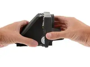 Аккуратно сожмите боковые стороны передней панели, чтобы освободить защёлки, и снимите панель с корпуса камеры.