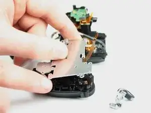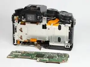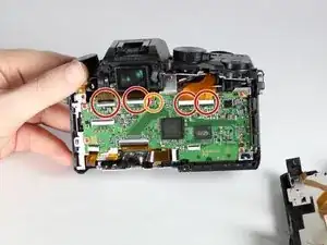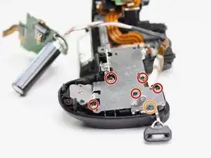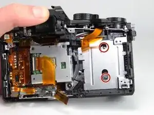 Используйте отвертку PH0, чтобы удалить два указанных черных винта длиной 6,0 мм сверху камеры, под механизмом вспышки.