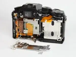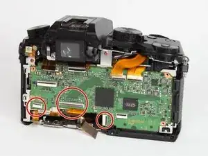 Удалите два указанных серебряных винта длиной 3,5 мм рядом с экраном видоискателя с помощью отвёртки PH0.