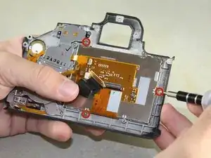 Отсоедините две светло-коричневые гибкие шлейф-ленты от задней стороны ЖК-экрана, крепко захватив каждую пинцетом и аккуратно потянув строго влево.