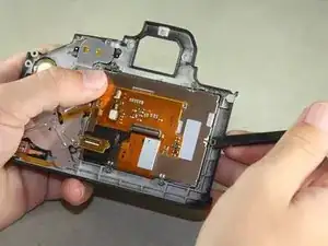 Чёрная гибкая шлейф-лента соединяет заднюю панель с внутренней частью камеры. Повреждение этой ленты сделает задний экран и кнопки неработоспособными.