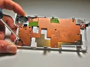 Используя точную крестовую отвёртку Phillips #00, выкрутите семь винтов длиной 4 мм (5 на нижней части устройства и по одному на каждой из двух сторон), удерживающих заднюю панель на корпусе камеры.